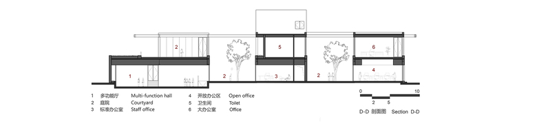 The office building consists of two floors, which present totally different visual impressions. 1F is enclosed and inward-facing, while 2F is open and outward-facing. Such contrast highlights the horizontal layout of the overall architectural space. The building has a "floating" rooftop, a solid pedestal and a transparent space in between, which is similar to the image of traditional architectures to some extent. Several two-storey-high courtyards separate 1F into three parallel horizontal functional blocks. In this way, each room on 1F is connected with a courtyard, ensuring ample daylight and forming diversified landscape. Besides, the block on the south itself includes some small-scale courtyards. 2F has a large area of glass curtain walls, which mark off various functional spaces of different scales and also enable indoor activities to be extended to outdoor terraces freely. Six bridges link the three functional blocks of the building, generating efficient circulation routes and further dividing off several inward-facing yards.