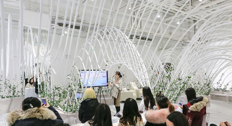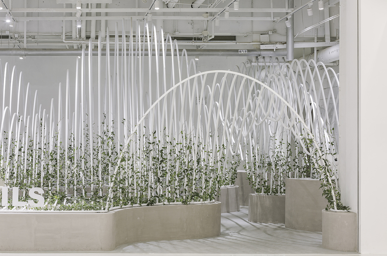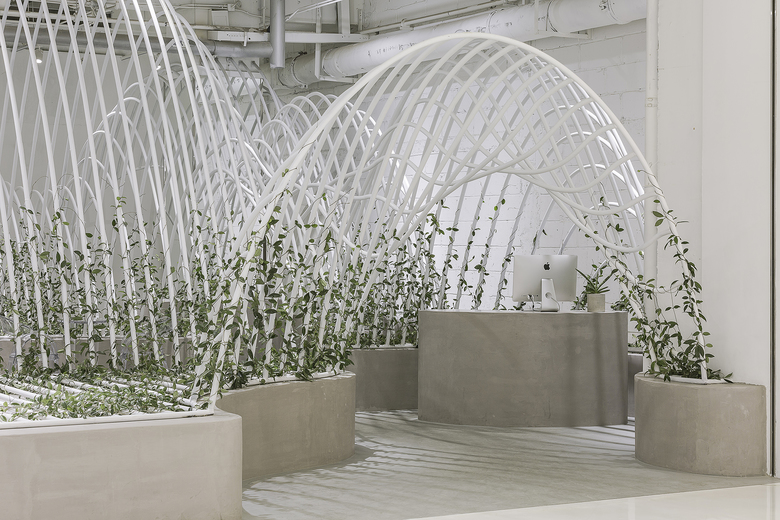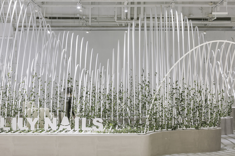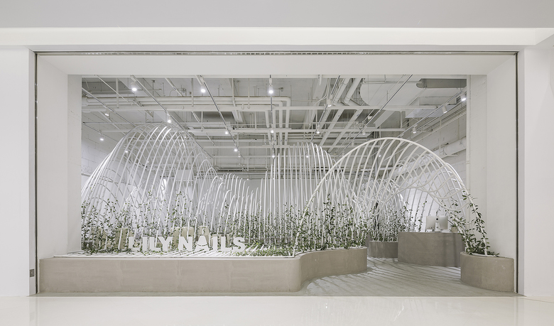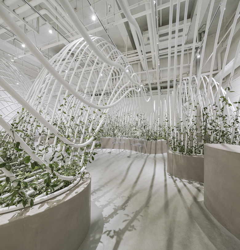 Firstly, the designers divided the whole space into public and private areas. The public area is an open botanic garden. According to the requirement of reception, waiting, manicure, activity, and other functions, it has 10 "hills" in different sizes. The "hills" are interconnected with each other to create an open and flowing path, and some white galvanized steel pipes in 32mm-diameter and 3mm-thickness are used to draw rolling outlines of the "hills". The abstract "hills" are placed on the 550mm high cement platform, around which is decorated with climbing plants. The green porcelain flowers are growing along the outlines vibrantly, reminding people of the changes in time and space.