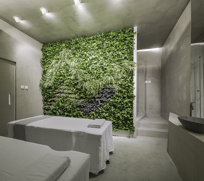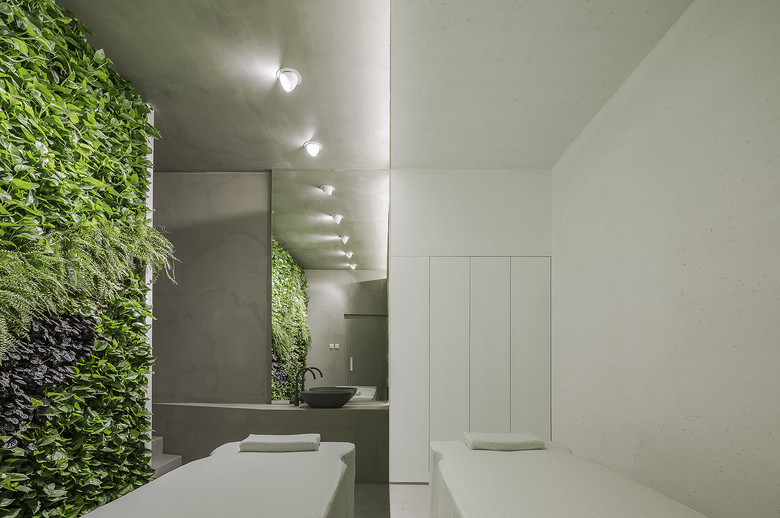 The private area is for beauty rooms and manicure rooms. With vertical green walls in the rooms, all of them like mini botanical gardens. Each square box is divided into white and gray parts. People sit in the white space and face the plant wall in the gray space, breaking the closed feeling of a single room. The greenery and light permeate through the glass gap in the room, and their shadows are projected in the corridor, creating more interactive experiences.