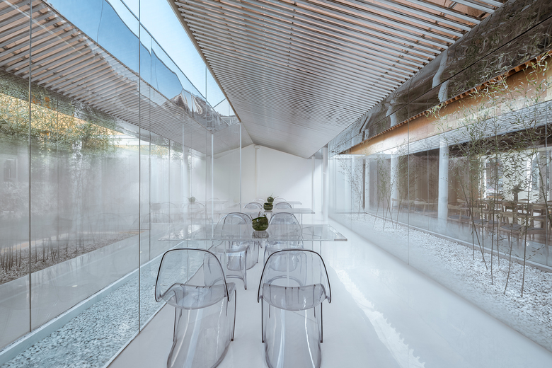 A prominent feature of traditional architecture is the layering courtyard. In a quadrangle courtyard with three layers, a house's function changes as people entering each yard, the privacy gradually increases from outside to inside, giving people an impression of "deep courtyard". The design was inspired by "multiple layering courtyard" in traditional spaces, thus the previous inner courtyard was changed into a "three-layered courtyard" in order to adapt to the transition from the public spaces to private spaces step by step, besides, the designers took advantage of the yard's layering structure to create a quiet, natural and poetic scene in a noisy Hutong neighborhood. "Layering Yard" has rearranged the relationship between new and old, inside and outside, artificial and natural. Firstly, the designers demolished some parts of the house roof in the south so that the first layer between the interior space and street yard was created, secondly, they added a slope-roof building between houses on the north and south, and then separated the old and new with two parallel yards. The three-layered courtyard allows all indoor spaces to be accompanied by bamboos and sunlight. The spaces are separate but penetrate with each other, the glass walls with spray patterns look like overlapping peaks, which further strengthen the translucent sense, thus achieving the layering juxtaposition of different scenes and living situations from outside to inside.