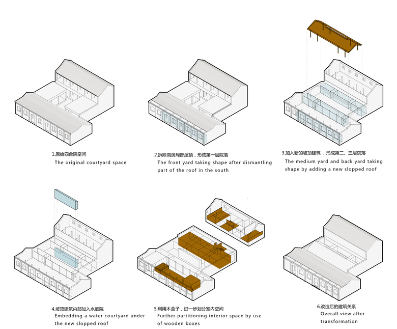 "Layering Yard" is hidden in a traditional commercial block near the Qianmen of Beijing, with an area of about 500 square meters. The original architecture was a quadrangle courtyard commercial building with the characteristics of houses in the Republican period. Compared with residential houses, the houses here are bigger and higher. There is a row of arched doors and windows on the south along the street, and two-story houses on the north. Before the renovation, the housing structure was completely rebuilt; with the courtyard there were no doors, windows or walls, but exposed rough wooden structure beams. It is said that it was a brothel in the Republican period, then transformed into a bakery after the foundation of China, and later was left unused after the reconstruction. In the future, the building will be a complex for public activities and living. Therefore, while improving the quality of construction and infrastructure, this renovation focused on creating experience in particular scenes based on the Hutong environment, aiming to attract urban population who have increasingly diversified consumption demands.