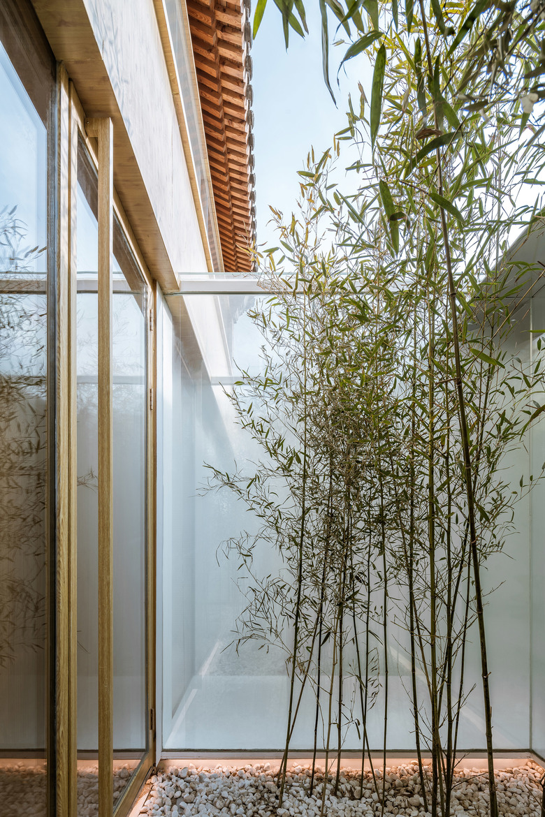 The house's usage patterns follows the naturally transition from openness to privacy of the three-layered courtyard. The south house is a place for public gathering activities, with an arrangement of reception space, dining room, bar, kitchen, office, warehouse and so on. The original wooden beam and column structure was preserved as much as possible, and two new wooden box service units were placed inside to divide spaces of different scales. Through the first layering yard, the window openings of the original building and the painted doors form the effect of "shadow wall", together they outline a real and colorful Hutong life scenes under the setting of bamboo forest. The house in the middle was changed into a flexible multi-functional space, which can be used together with the front restaurant, or as an independent exhibition hall, or be integrated with the guest room area to become a rest area. The designers tried to consider the harmonious relationship between the new building and the two old slope-roof buildings on both sides in terms of the scale, lighting and distance. The inner spaces were built around a linear waterscape garden, and mainly used transparent, translucent, reflective materials and furniture to weaken the spaces' physical feeling and create a light, transparent and floating atmosphere that is different from the old building, making the spaces allusive and concealing in the bamboo courtyard. Houses on the north side are the most private places. The designers made use of the original structure to divide the first floor into four rooms. The rest area and bathroom area were separated from each other by the change of materials. Each guest room has an individual bamboo courtyard, and the inside and outside are stacked with one another. The second floor was divided into three rooms of different sizes. Through the floor glass curtain wall, people can enjoy the best views of layered gray tile roofs, green trees and blue sky. All rooms are equipped with facial recognition and intelligent control system. Guests can book a room online and scan a code to check in, providing an easier and more convenient living experience.