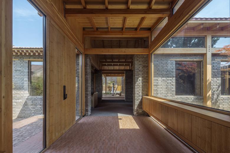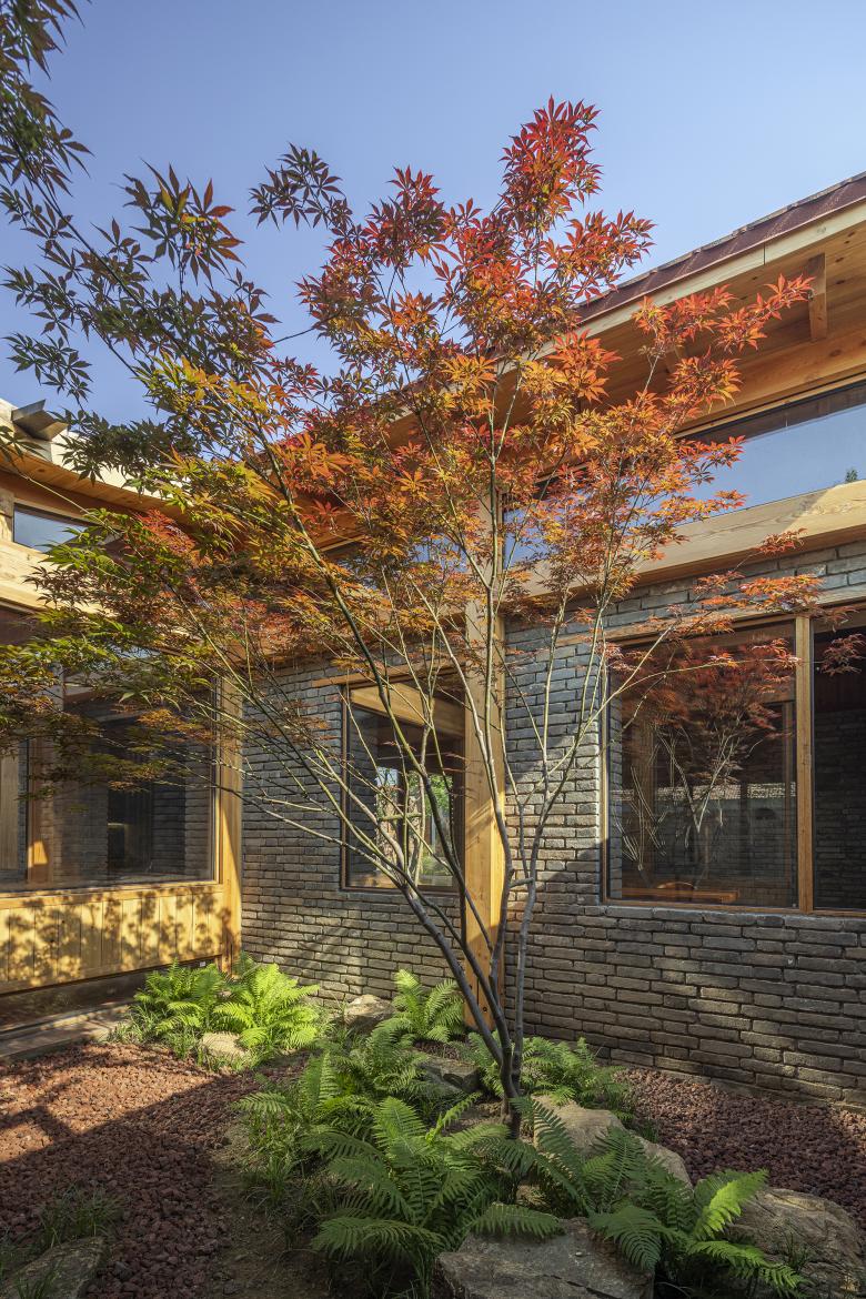 The space at the back is the bedroom area. The north building and the wooden construction are connected by a glass corridor, which naturally forms a narrow yard. The three bedrooms provide a direct view to the outdoor landscape, satisfy daylighting and ventilation needs, and meanwhile avoid obstructed sight lines. The organization of various yards brings natural vitality into every corner of the interior space.