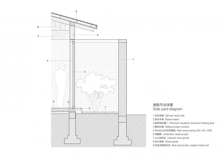 The newly built enclosure walls are completely made of red and gray old bricks recycled locally, which realizes the reuse of waste materials. When renovating the existing buildings, the design team decided to remove and polish the white ceramic tiles on the exterior of the preserved north building to expose its red-brick walls. As demolishing parts of the south building's roof, the designers found that its original structures were seriously damaged and the walls under it were at the risk of collapse. Therefore, they took the roof apart, and replaced some old wooden components with new ones. Meanwhile, the walls were rebuilt with old gray bricks in consistent with their original forms.