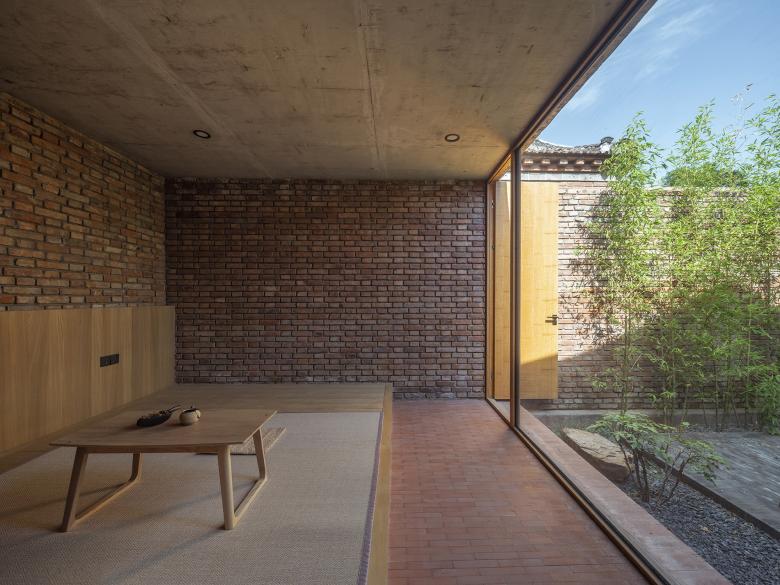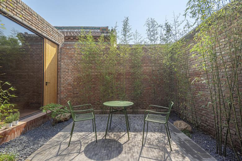 The original spatial pattern featuring one front yard and one back yard are reorganized, to form six yards with different scales, landscapes and functions. The front yard is set at the southwest core of the site. Opening the metal gate, a bamboo path leads the occupants to the building entrance. Pushing the door and entering the foyer, a courtyard with a maple tree comes into view. The maple tree displays the colors of nature in different seasons, and becomes a highlighted view between the living room and the dining room. Space set aside between the living room and the south enclosure wall forms a side yard, where trees and stones are set. In sunny days, the folding doors of the living room can be completely opened, to extend the yard into the interior.