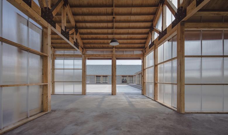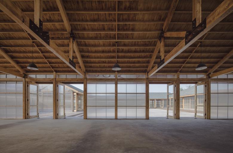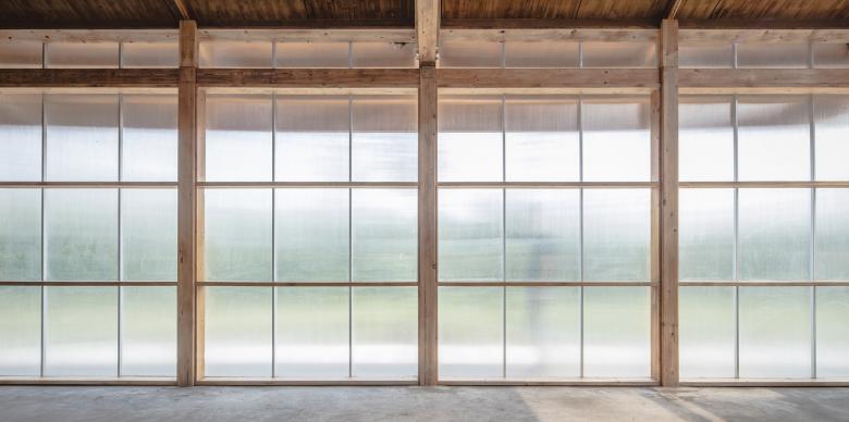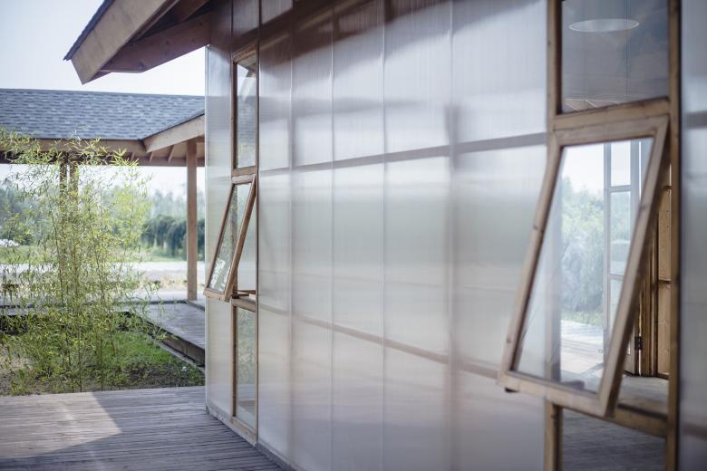 The design chooses glued timber structure as the major structure due to its light weighted, easy processed and installed and natural properties. The building is “floating” above the ground. It sits in a 60cm cement base, which allows the wood structure being moisture proofed against the ground and allows it to hide pipelines of some fixed equipments. In order to control the construction budget reasonably, the building adopts light wood struc-ture- wood frame wall with a length of 2.1m, the upper part is glued timber truss beam, and the top is wooden and felt roofing. The facade is covered with translucent pc board which is light and easy to be installed as well. The space, structure, materials and the mul-tiple layered exterior courtyards together creates a warm, natural and continuous working atmosphere for this farm.