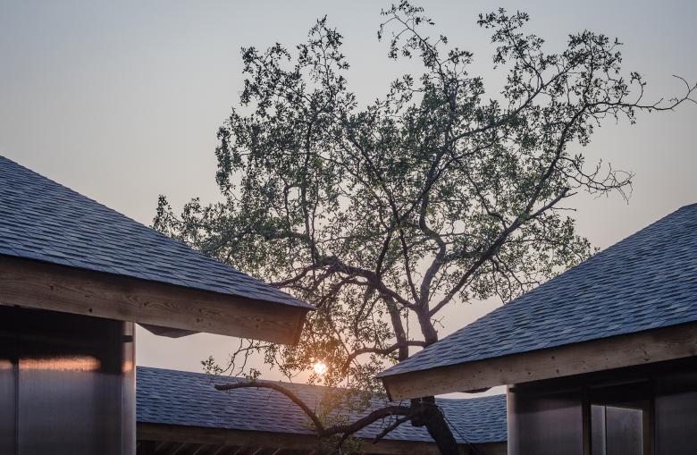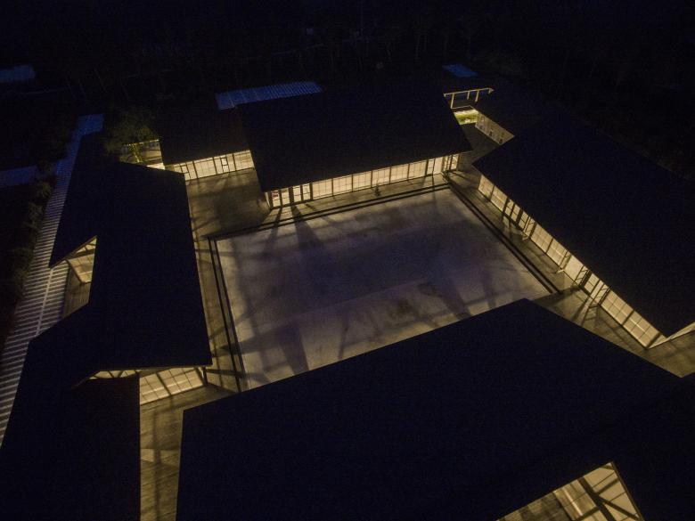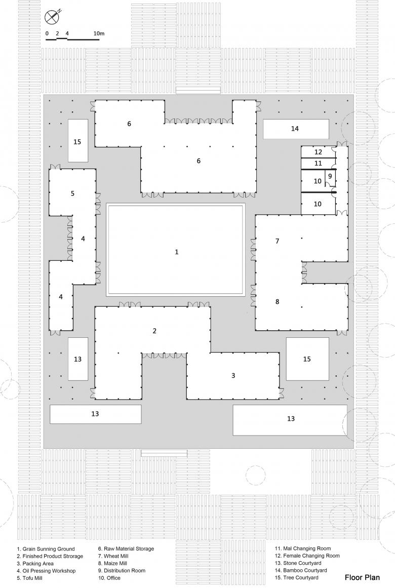 The entire building is made up of four enclosed relatively independent houses, including Material Storage, the Mill, Oil Pressing Workshop and Packing Area. The inner courtyard is the Grain-Sunning Ground, and a convenient work cycle line is formed around the inner courtyard. The boundary of the building is the external corridor that connects the four are-as, and it is the route to visit the food processing workshop. The central courtyard spans out around the building randomly, topologically form a courtyard space of multiple layers, which meets the demand for natural ventilation, natural lighting and views of a workshop while maintaining nice interior and exterior space quality. The organic connection of court-yard and house creates functional areas of different sizes under one big roof: small sized corridor, medium sized rooms and large sized workshop, which flexibly meet the require-ments of compound use of the workshop.