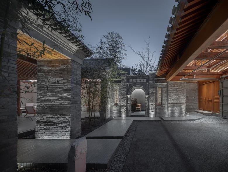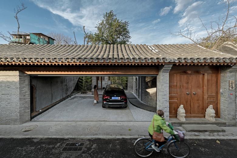 The front courtyard is mainly used as a garage. ARCHSTUDIO retained its pitched roof, removed the front and back walls, and shifted the entrance door to the side, so as to leave more space for parking. The design team restored and preserved many valuable historical elements such as the gateway and carvings of the arched door opening, and even a dry tree. In addition, the wall between the front and middle courtyards were dismantled and replaced by a transparent veranda.