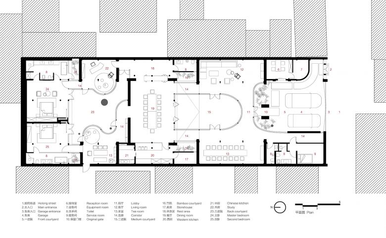 The renovation project is located in a huton within a core old quarter of Beijing. It's a small Siheyuan (a typology of traditional Chinese residence) with three courtyards, with a total length and width of 15 and 42 meters. It's named as "Qishe" ("Qi" and "she" respectively refers to "seven" and "house" in Chinese language), because its address number in the hutong is 7 and it originally consisted of 7 pitched-roof buildings. The Siheyuan before renovation was old and dilapidated. The basic wooden beams and some arched door openings featuring the style of the Republican era were relatively well preserved, while most of the roofs, walls, doors and windows were badly damaged or disappeared. In the three courtyards, there were many temporary architectural blocks inserted many years ago. After demolishing those blocks, the yards were filled with waste of construction materials and overgrown with weeds, presenting a bleak view.