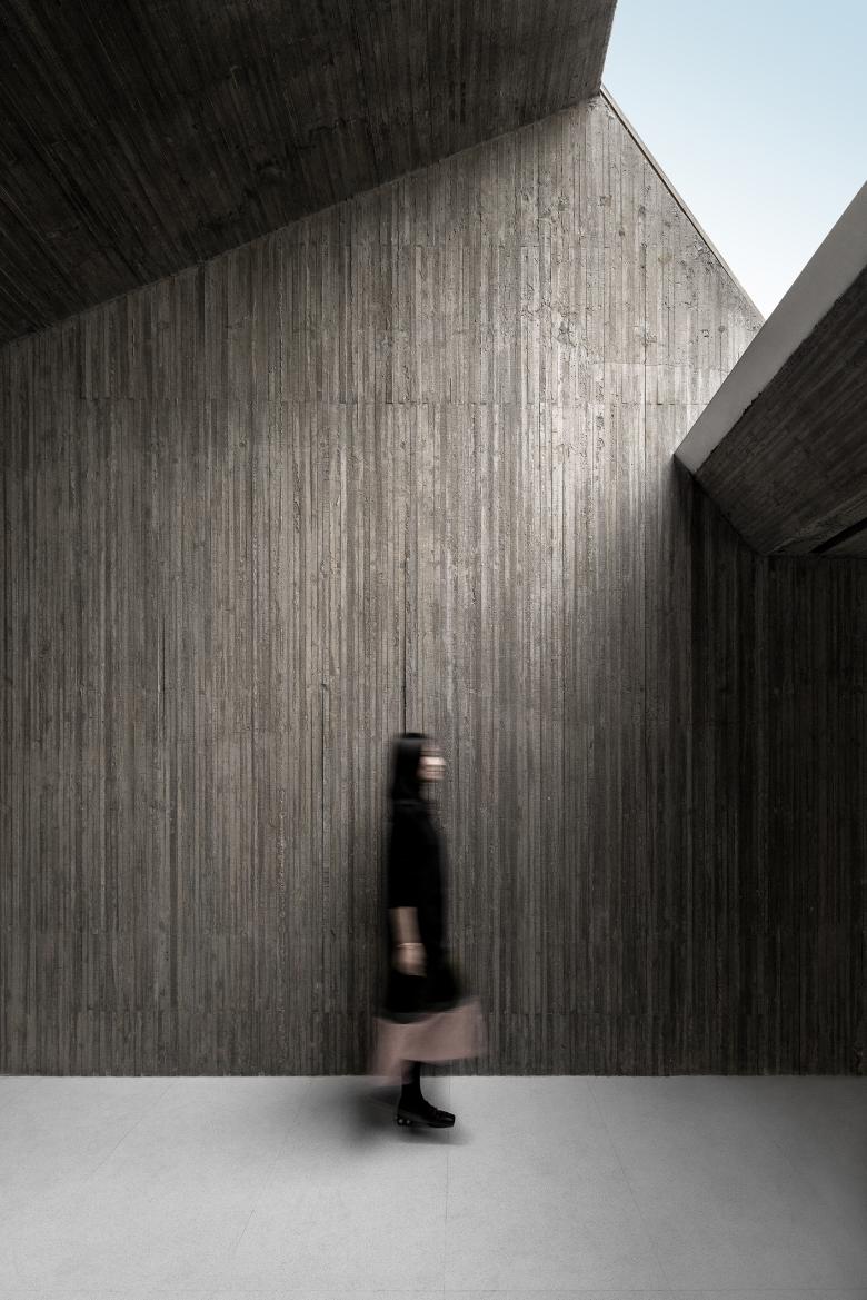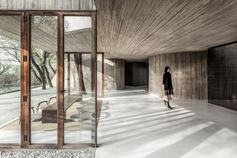 The relationship with nature further extends to the use of materials. Integral concreting is used in walls and the roof of the building. The concrete formwork is pieced together with pine strips of 3cm width, in this way natural wood grain and vertical linear texture are impressed on the interior surface, creating a soft and warm feeling to the cold concrete materials. Built-in-furniture is custom-made with wood strips, whose grey wood grain is a little bit different from the concrete walls. Smooth terrazzo is used for the interior floor, where there is thin grain of stone on the surface, and it maps the outdoor natural landscape into the interior space. Cement grouting with white pebbles is adopted in outdoor flooring, which creates a difference in sense of touch between indoor and outdoor floor. To reflect natural texture of the materials, solid wood is used for all doors and windows. Zen stresses on complying with nature and being part of nature. That is also the goal of the design for this space—taking use of space, structure and material to stimulate human perception, thus helping man and building to find the charm of nature even in an ordinary rural landscape, and to coexist with nature.