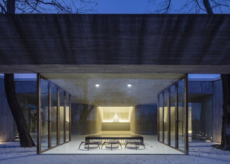 This is a place for Buddhist mediation, thinking and contemplation, as well as a place satisfying the needs of daily life. The building is located in the forest by the riverside. Along the river, here is a mound, behind which is a great stretch of open field and sporadic vegetable greenhouses. The design started from the connection between the building and nature, adopts the method of earthing to hide the building under the earth mound while presenting the divine temperament of nature with flowing interior space. A place with power of perception where trees, water, Buddha and human coexist is thus created.