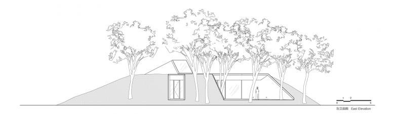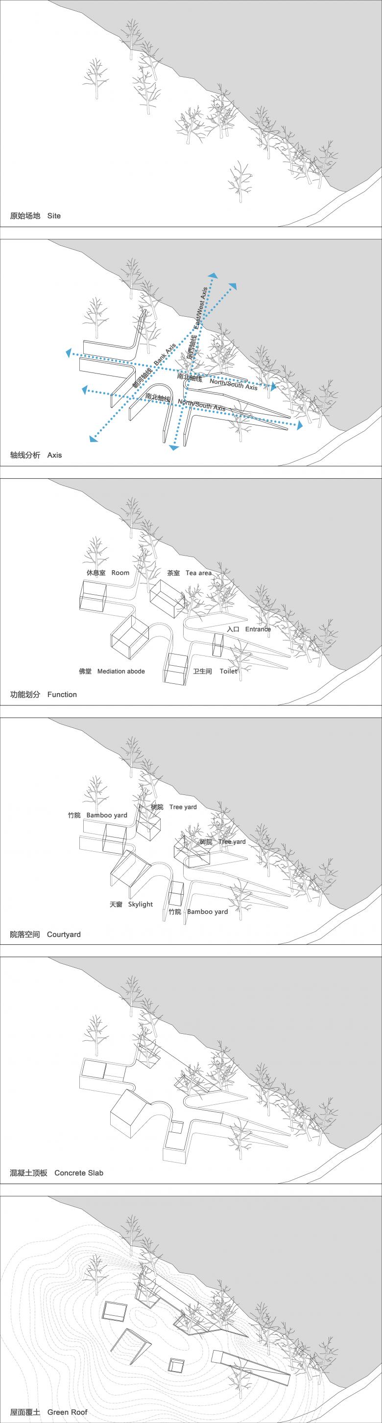 To remain trees along the river perfectly intact, the building plan avoids all trunks. Shape of the plan looks like branches extending under the existing forest. Five separated and continuous spaces are created within the building by two axis, among which one is north-south going and another one goes along the river. The five “branches” represent five spaces of different functions: entrance, Buddhist meditation room, tea room, living room and bathroom, which form a strolling-style experience together . The building remains close to trees and natural scenery. The entrance faces two trees; people need to walk into the building through a narrow path under the trees. The shrine is against the wall and facing the water, where the light and the shadow of the trees get through the skylight and flow into the interior space softly along the curved wall, exaggerating the light of Buddha. The tea room opens completely to the pool which is filled with lotus, and trees on both sides of the tea room has become part of the courtyard, creating a fun of tea tasting and sight-viewing. The lounge is separated from other parts of the building by a bamboo courtyard; such division enables daily life varies with different hours of a day. The whole building is covered with earth and becomes an extension of the land, as another “mound” which could be used under the trees.