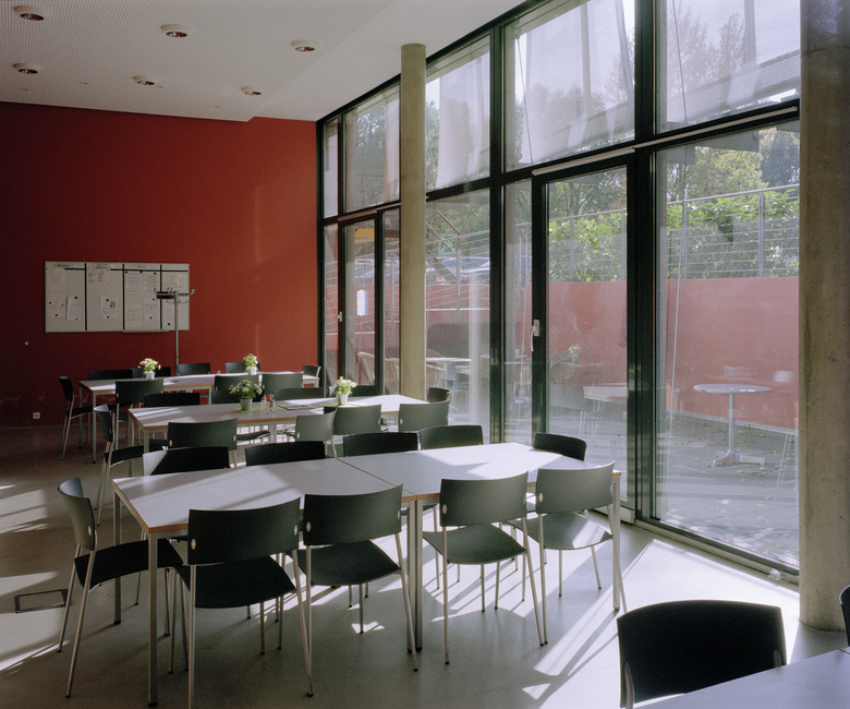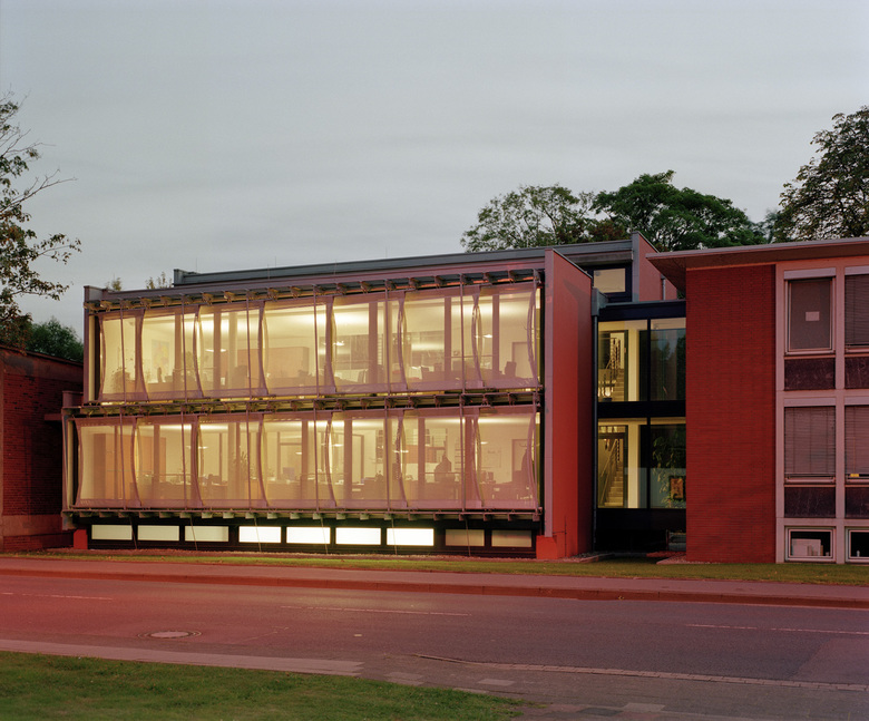 The implementation of alternating halfstoreys facilitates communication within the different teams. The generous glazing on two sides of the building displays a sun protection system with tightened textiles. The consumption of energy is optimized through a well isolated building envelope and the translucent textiles absorbing the intrusion of direct sunlight.
