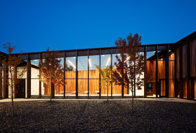 The building’s exterior, with its rough cladding of deep rust-colored corrugated Corten steel sheeting and its elegant, floor-to-ceiling glazing, emphasizes both its industrial context and its representative function. Inside the building, raw, industrial materials with refined surfaces establish a warm, almost homey atmosphere. The construction of black steel, polished concrete floors, expanded metal mesh panels and charred wood walls characterize spaces where industrial production and exhibition are coherently integrated.