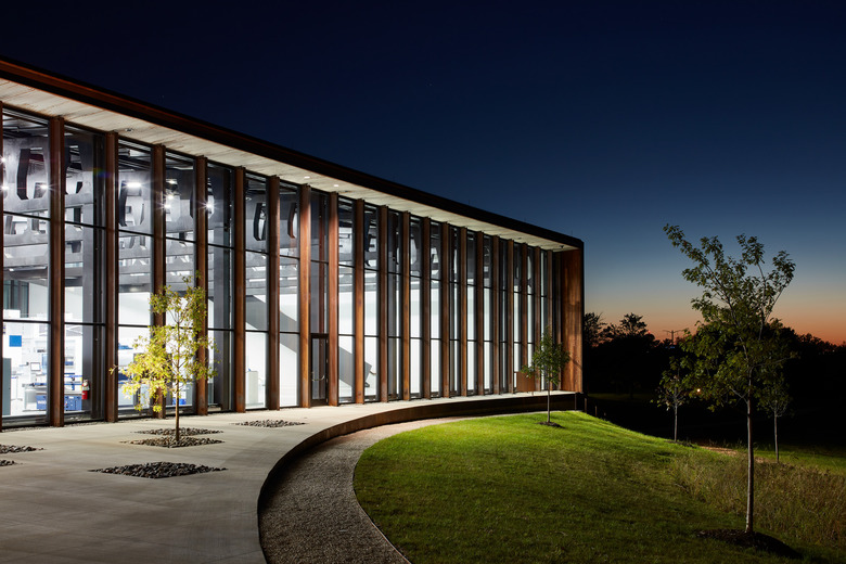 Choosing a location for the new “Smart Factory” largely centered around a consideration of infrastructural conditions: the site is prominently located on Interstate 90 near Chicago O’Hare International Airport. Against the backdrop of the surrounding industrial zones, its immediate setting appears almost idyllic: organized into two large volumes, the building gently slopes back towards a large retention pond, a reservoir within the wetlands surrounded by lawns.