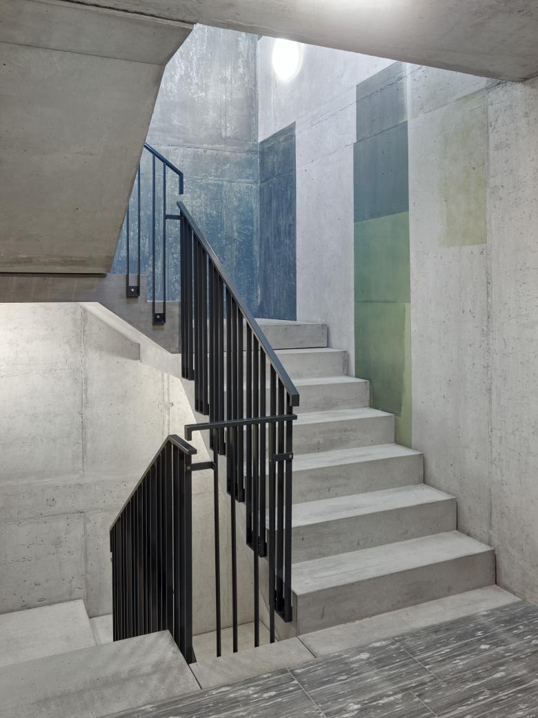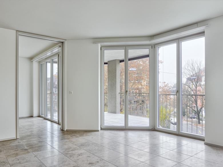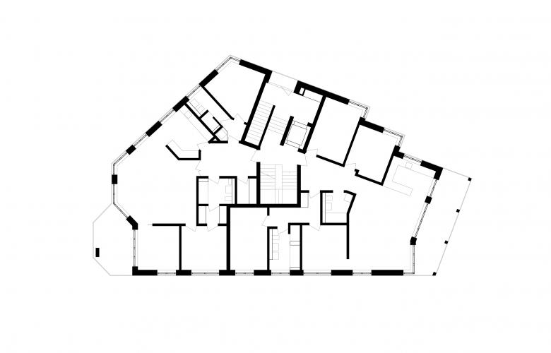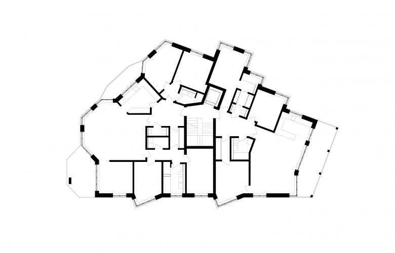In accordance with the neighbouring buildings, the house entrance is on the mezzanine level on the northern façade. Two apartments per floor are accessed via an entrance hall and an interior staircase. The apartment floor plans are orientated towards 19th-century chambered spatial sequences, as well as modern forms of living.