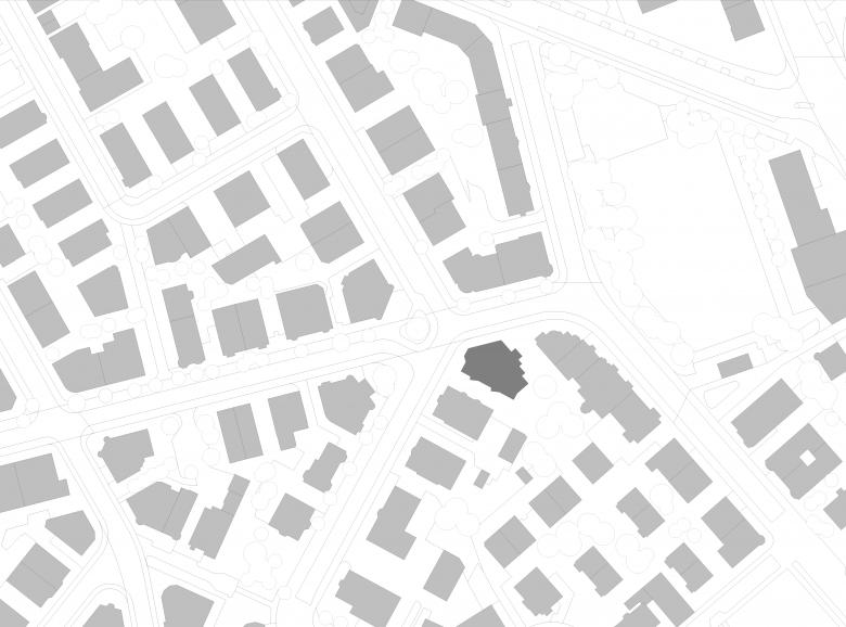 The new building addresses that diverse architectural heritage. Based on the original development plan from the 19th century, it strikingly occupies the street junction, following the original building lines. The architectural elements of the surrounding buildings are picked up on through the sculptural, expressively structured façade with striking vertical and volumetric accentuation at the junction. The building, with its prominent roof conclusion, has a tower-like quality, thereby referring to the architectural repertoire of the context. The side and garden façades are formulated in a much simpler way.