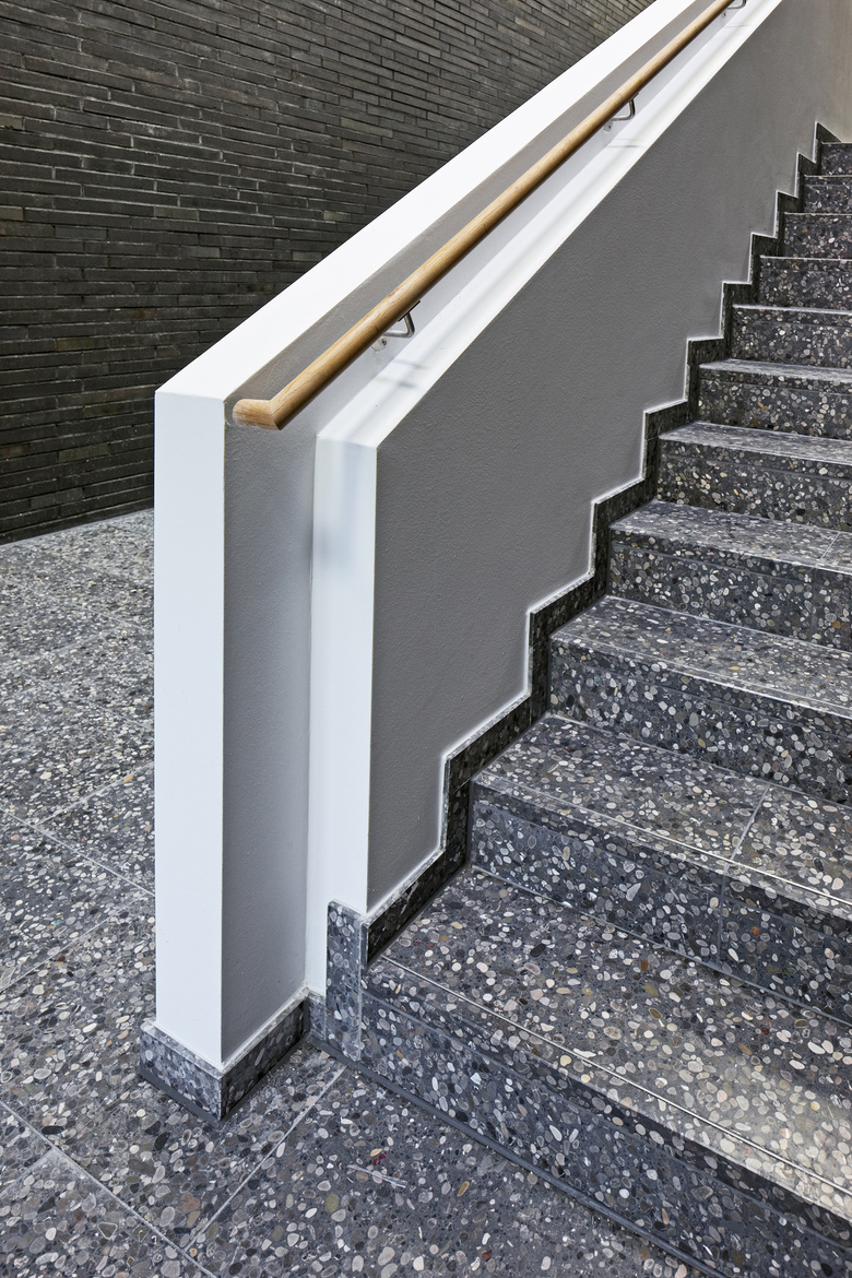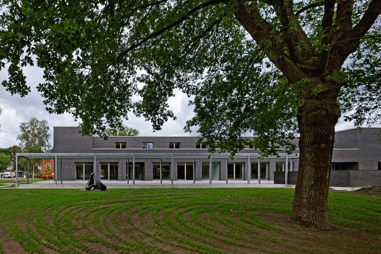 Einschnitte markieren auf der Südseite die Eingangsbereiche und bilden auf der Nordseite im Bereich der Wirtschaftshöfe zusammen mit den Vordächern die geforderten geschützten Anlieferungsbereiche.