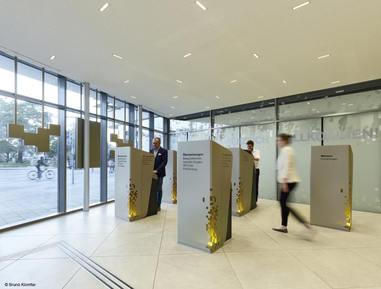 A visit to a branch follows a certain dramaturgy: the “Pixel Wave” is an eye-catcher that captivates passers-by and draws them in. A self-service area is spacious and open. All elements and contact points are clearly defined and provide customers with a sense of orientation and security. A Welcome Desk as a first inviting point of contact is placed centrally. Comfortable lounges and highly personal consulting spaces are available to customers. A cash counter area is designed to provide utmost discretion. Floor plans and furniture are designed to guarantee a high degree of flexibility and multifunctional use.