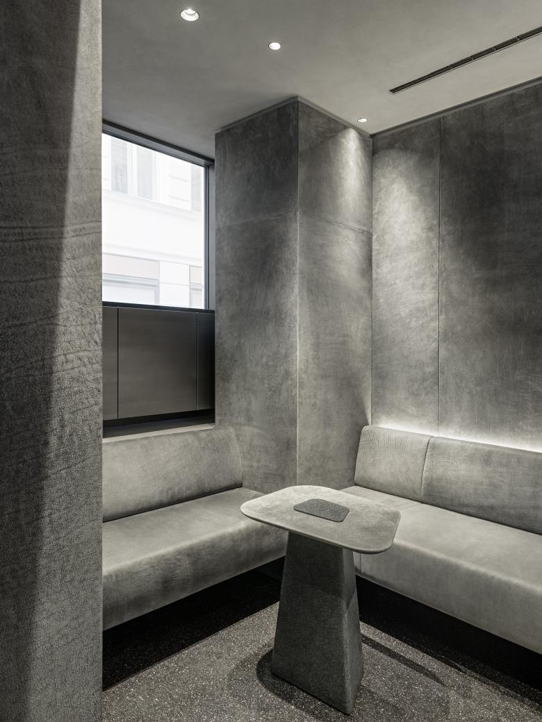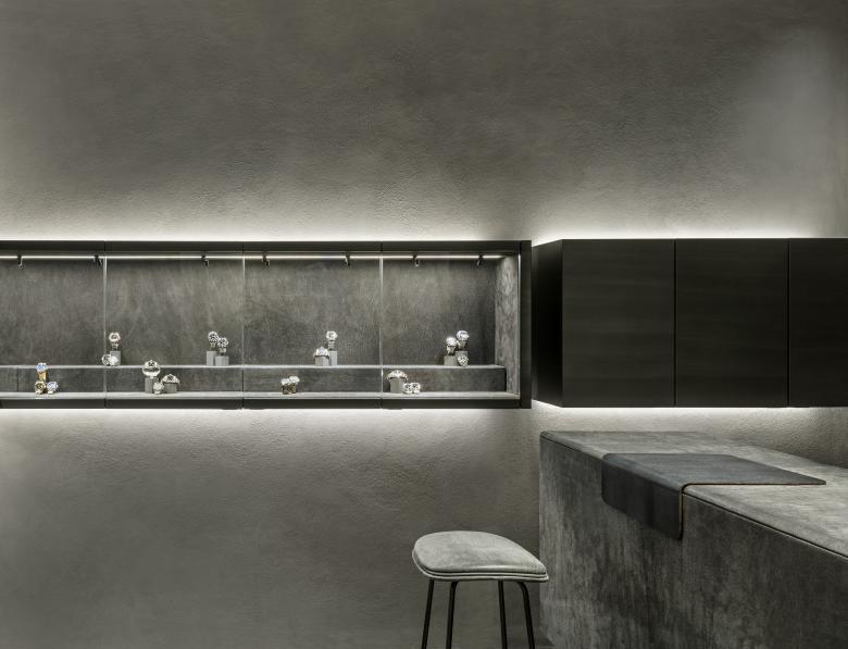 Deliberately earth materials in grey colour strongly strengthen the existing structure and contrast with the subtlety of watches. Leather, rough lime mortar and terrazzo versus smooth, polished, shiny surfaces of watches. This creates a calming and almost holy mood. The most important design elements are deliberately withdrawn, the light that is used emphasises the room. Leather-covered tables look like altars. Here, the customer can look at the selected watch in peace and quiet and get detailed advice. On the other hand, there are showcases, both indoors and outdoors, which maximally present the exhibited watches, supported by digital surfaces that complement the communication.