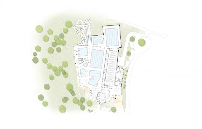 Inside, these dynamically arranged roof surfaces mark out the various pool areas in a playful fashion without disturbing the aquatic landscape’s open nature. The arrangement of all the pools has been custom-tailored to suit the site’s unique location. In the center, we find a pool that invites swimmers to “get in a few laps.” The adjacent non-swimmer and toddler pools as well as the water playground face toward the southern facade. Here, we also find the food court and adjoining terrace and a grassy area for sunbathing. Guests find it easy to navigate this single-story swimming area located at ground level. Lightweight glass dividing walls delineate the quiet area, screen the slides’ landing area, and offer a high level of privacy for the learning pool and the second 25-meter swimmers’ pool.
