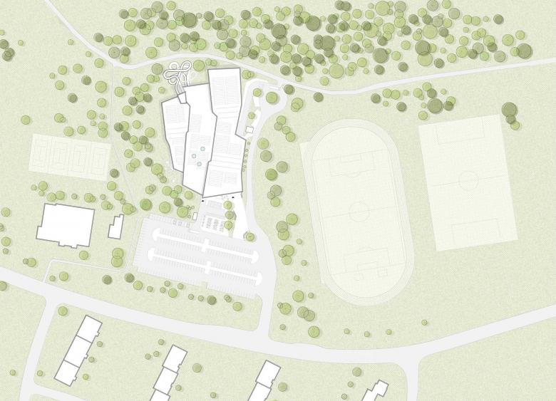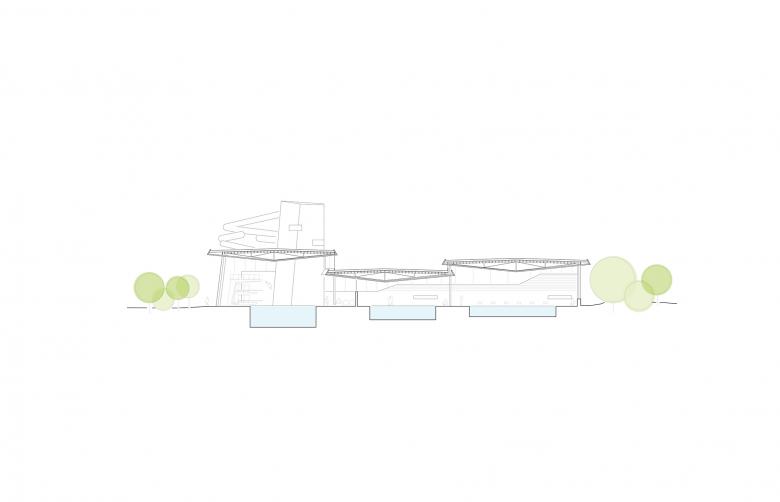 This lively aquatic landscape includes two 25-meter swimming pools, a non-swimmer’s pool with a slide, a toddler pool, a warm-water pool, a learning pool with a lifting floor, diving facilities, two giant slides, and a water playground. The ceiling heights vary to meet the needs of the different areas and help generate a fascinating, three-dimensional spatial composition which offers not only a feeling of security but also a large open area that encourages visitors to interact with one another. A harmonious arrangement of three roofs lends the building a sculptural flavor with an underlying sense of invitation.