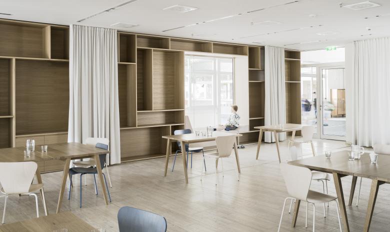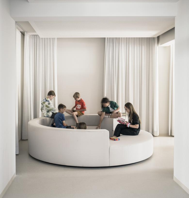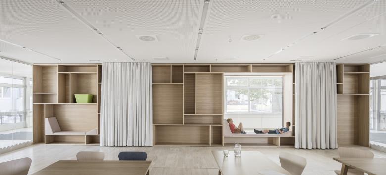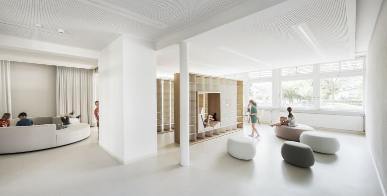 Neue Raumstrukturen für Mittagstisch und Schulkindbetreuung mit einladenden Aufenthaltsbereichen, Bibliothek und Verweilzonen in entspannter Atmosphäre - das waren die Anforderungen an die Umbaumaßnahme in der Volksschule Montfort, die derzeit von ca. 230 Kindern besucht wird. Der Bereich unmittelbar beim Eingang in die Schule und den Pausenhof erwies sich für diese Funktion am geeignetsten.