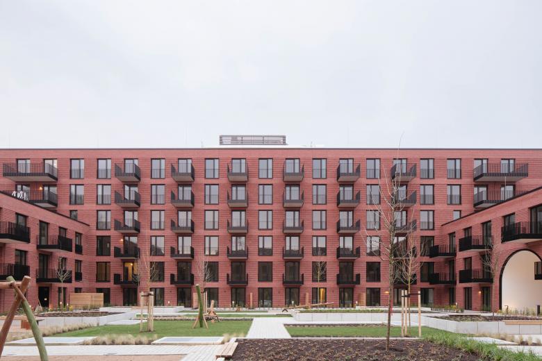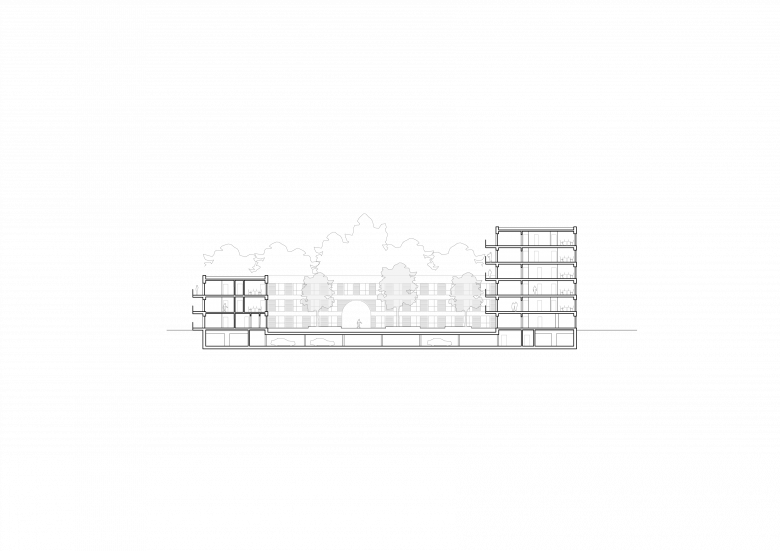 Der Entwurf basiert auf einem klaren Entwurfsraster, welches sich sowohl in der äußeren Fassadengestaltung, als auch in der inneren Struktur des Baukörpers wiederfindet. Das städtebauliche Prinzip wird hier zum maßstabsübergreifenden Entwurfsthema und findet seine visuelle Umsetzung sogar in der innenliegenden Raumwirkung. Der Baukörper ist in seiner Geometrie klar definiert. Die Seitenlängen sind identisch, während die Gebäudeteile an der Ost-, Süd-, und Westseite auf 3 und auf der Nordseite auf 6 Vollgeschosse begrenzt sind. Die Erschließung der Wohnungen erfolgt nahezu ausschließlich über den gemeinschaftlich genutzten Innenhof. Die vormalige Nutzung als Kleingartensiedlung findet sich hier in einem auf dem Entwurfsraster basierenden Patchwork wieder. Die differenziert gestalteten Flächen spiegeln vielfältige Funktionen wider. Der Großteil der Wohneinheiten bildet durchgesteckte Wohnräume aus. Der Bewohner hat die Möglichkeit sich einerseits dem Grün nach Außen hinzuwenden und andererseits an dem Leben im Innenhof teilzunehmen.