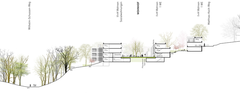 Die Hangkante nach Westen wird mit 3 kräftigen raumwirksamen Geschosswohnungsbauten gefasst, die für den sozialen Wohnungsbau vorgesehen sind. Auf der gegenüberliegenden Seite des Wohnhofs befinden sich Reihenhäuser. In beiden Wohnformen werden im EG gewerbliche Nutzungen angeboten, die den Wohnhof beleben. Um das Bellevue gruppieren sich ein Baustein für Seniorenwohnen und ein Geschosswohnungsbau für eine Baugemeinschaft mit dem Quartierscafe im Erdgeschoss. An der Einfahrt zum Quartier befindet sich ein Geschosswohnungsbau für studentisches Wohnen. Entlang des Matthias-Koch-Wegs prägen 4 Einfamilienhäuser die ortstypische Villenstruktur.