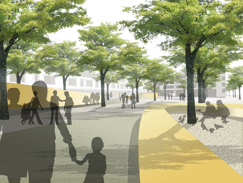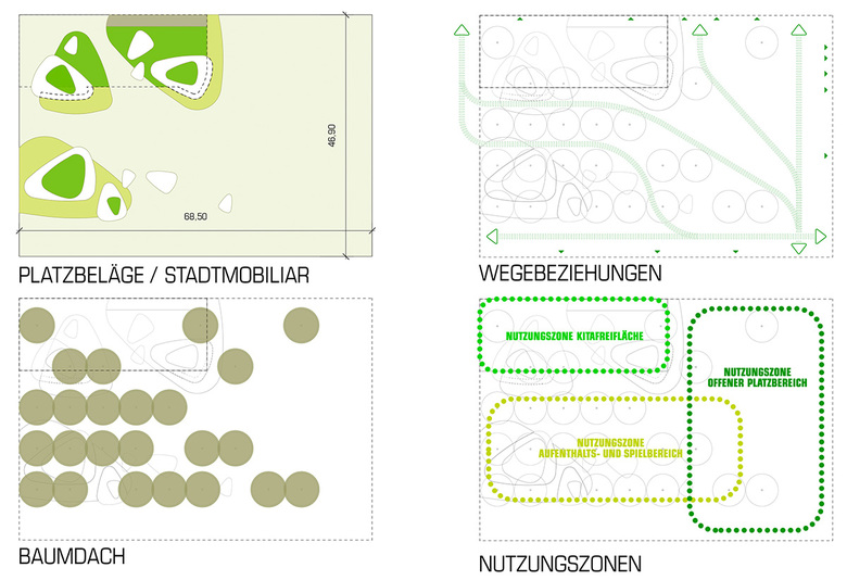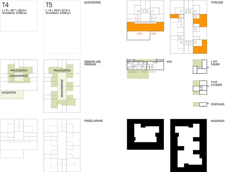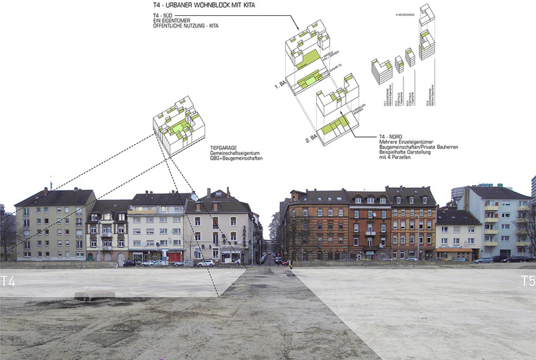 Konzept: Diese beiden vorgefundenen Freiraumtypen werden ergänzt durch den neuen Glacisplatz südlich von T4. Das Konzept sieht zwei unterschiedlich große Baublöcke, T4 und T5 mit einer Höhe von 4-6 Geschossen auf den historischen Raumkanten der Mannheimer Quadrate vor. Dem Platz zugewandt, befinden sich im T4 Block die öffentliche Nutzungen wie KITA, Mehrzweckraum sowie Tüftlertreff, Stadtteilbüro und im kleineren Umfang Läden bzw. Dienstleistungen im T5 Wohnblock. Der T4 Block wird im Erdgeschoss durchgängig durch nicht Wohnnutzungen geprägt, die ein starken Bezug zum öffentlichen Raum haben.