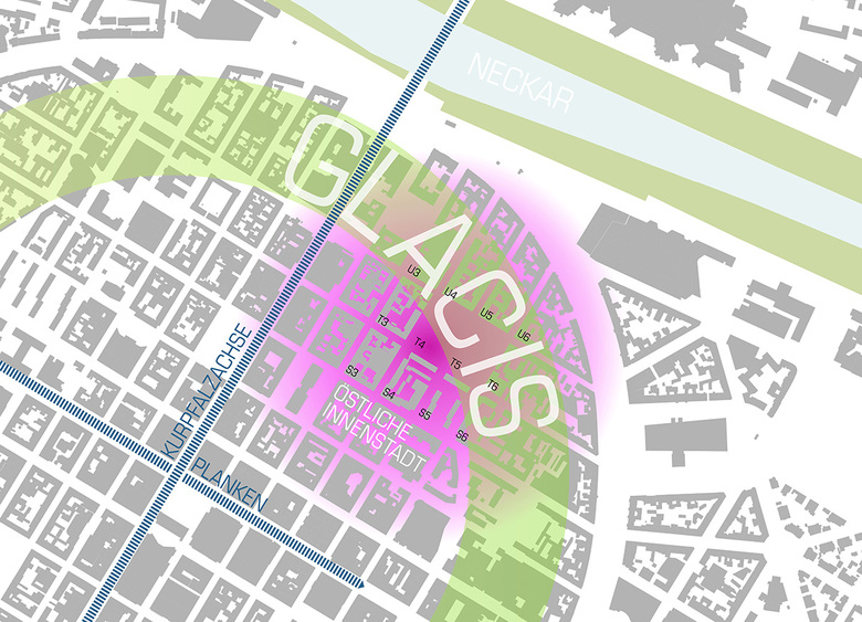 Im Quartier finden wir diverse Platzräume vor, teilweise nur Raumaufweitungen, mit unterschiedlichen öffentlichen Nutzungen. Außerdem sind im Stadtgrundriss heute noch Spuren der ehemaligen Befestigungsanlagen – den inneren Gürtel der Wallanlage – als diagonale Raumstruktur ablesbar, vom Lameygarten über den Herschelplatz bis zum Neckarufer.