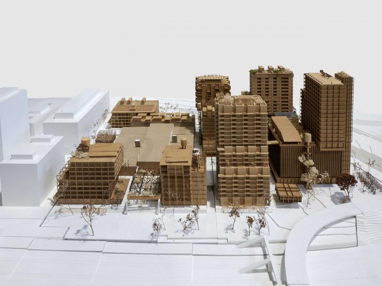 Die gestapelte Stadt zeichnet sich in erster Linie durch die sozialräumliche Schichtung und erst in zweiter durch die gestalterische Stapelung aus. Neben der baulichen Dichte braucht es auch eine Nutzungs- und landschaftliche Dichte. Ein einheitliches baufeldübergreifendes Raster und eine klare Schnitt-Lösung bilden die robuste und resiliente Grundstruktur, die viel Freiraum für zukünftige Entwicklungen und Veränderungen bietet. Die Stadtterrasse auf 30 Metern ist eines der zentralen Elemente der gestapelten Stadt und übernimmt eine Vielzahl an Funktionen. Neben statischen und raumhaltigen Funktionen verbindet sie die Gebäue miteinander und ermöglicht als gemeinschaftlicher Aussenraum «bodennahes» Wohnen im Grünen. Als Baustein der Schwammstadt ist sie über vertikal begrünte Fassaden und Treppenhäuser mit der gewerblichen Stadtebene unterhalb der Terrasse verknüpft. Die Holz-Hybridbauweise mit konsequenter Systemtrennung, kreislauffähigen Materialien mit tiefem Grau-Energiewert sowie der Fokus auf passiven energetischen Massnahmen, erfüllen hohe ökologische Ansprüche.