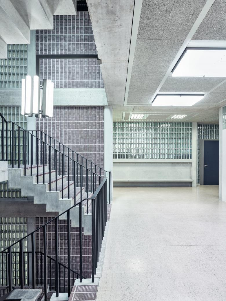 Similar stones are used as acoustic elements in the interior. As part of an Art and Architecture project, mosaics were made and worked into the floors as inlays. This work, inspired by natural stone mosaics in Italy, has become affordable because the stones can be cut into shape by machine today. The newly developed and hand-formed glass rods in the foyers and stairwells were made near Murano. Due to their inclusions, imperfections and irregular surface, they provide atmospheric lighting in spite of the use of industrially manufactured LED lamps.