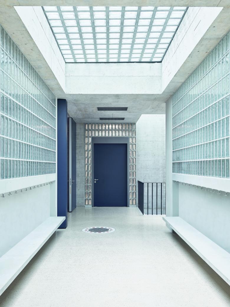 The common rooms are located in the head of the school building: a spacious foyer, the library, special rooms and the teachers' rooms. The elongated part of the building houses kindergartens and an after-school care center on the ground floor, and classroom clusters on the upper floors, which can be combined and organized differently with the help of folding walls. In front of the gymnasium is a multipurpose hall on the entrance floor, which can be accessed separately via the entrance hall. The changing rooms are located in the basement, as well as the equipment storage room attached to the hall.