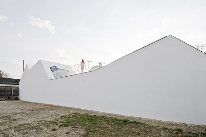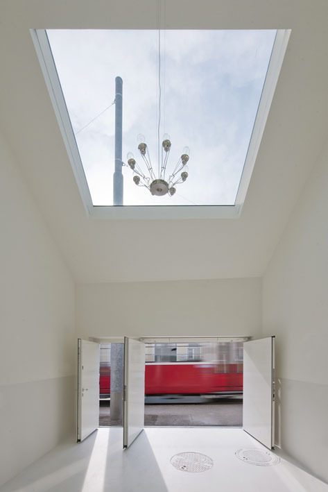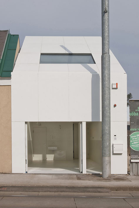 From the outside, one enters a relatively enclosed white spatial sculpture, which then continues to open up vertically as one proceeds from the studio / garage in the entrance area to the living area and atrium garden. In this way, an internal set of very spacious interlocking rooms is developed, despite the narrowness of the property.