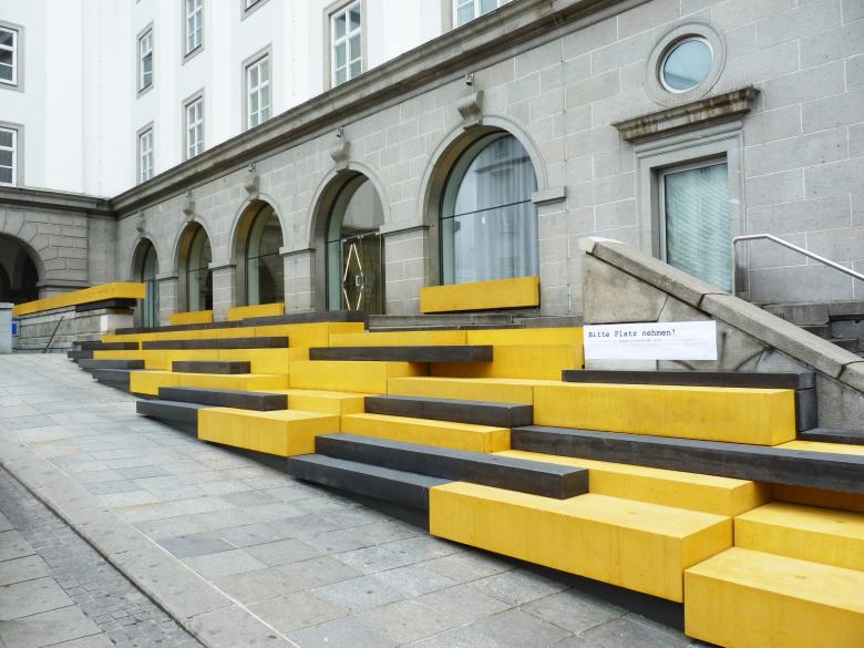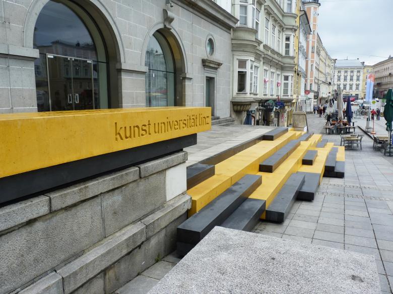 Around 60 colored concrete cuboids in black and yellow adorn the forecourt of the Kunstuniversität Linz on Hauptplatz. Designed by Caramel Architekten, this gift from the Kunstuniversität Linz to all Linzers is intended to invite them to linger and at the same time strengthen the visibility of the educational institution in the urban space. Inspired by the temporary seating steps at the same location during "Linz 09", then also penned by Caramel, this newly created form of street furniture is intended to open up the Kunstuniversität Linz as well as the "splace am Hauptplatz" to the Hauptplatz - and vice versa.