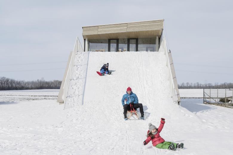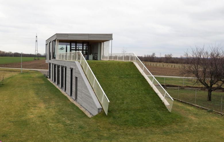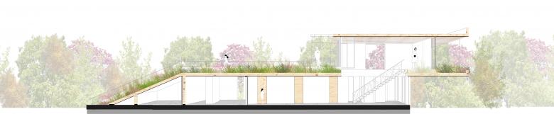 On the southeast side, on the slope side, the room opens to the maximum to the greened outdoor space and allows it to merge with the interior. The terrace flows smoothly into a lawn for sunbathing, merges into the slope for tobogganing and rolling down. The roof over the "summit" is also designed as a green roof.