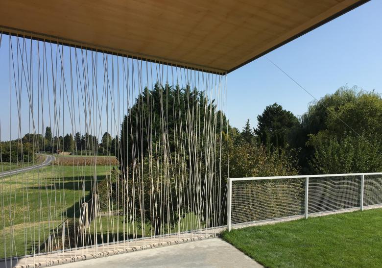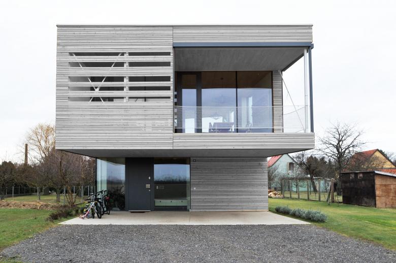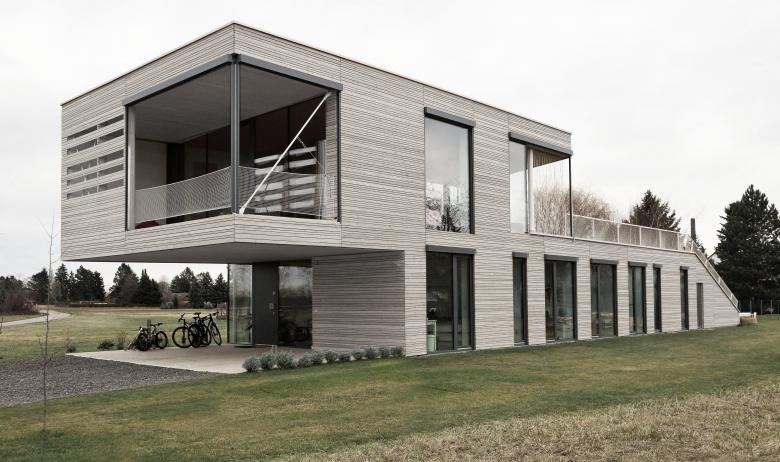 The wooden structure emphasizes the rural character without drifting into the vernacular. The cantilevered upper floor, the top of the "mountain", creates a covered area that also functions as a sheltered car, bicycle parking and entrance area. Thus, one can reach the interior of the house directly from the car with dry feet.