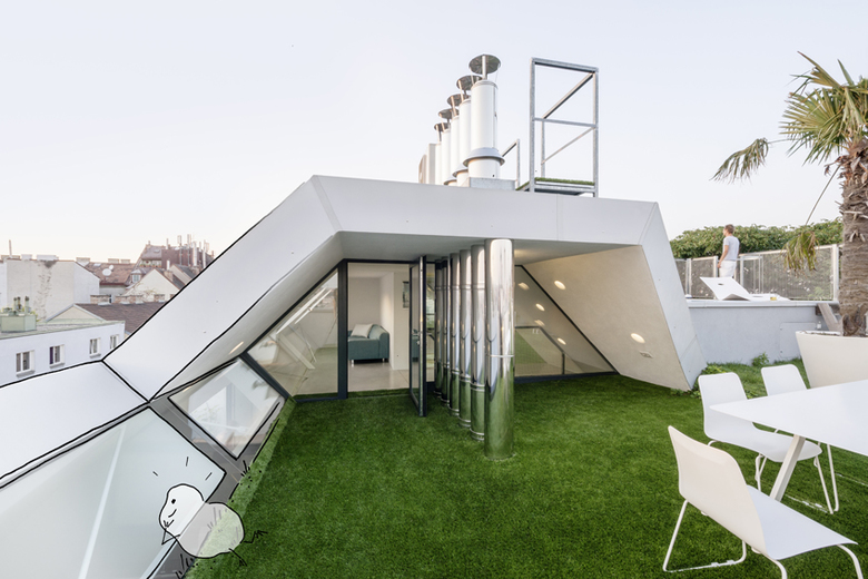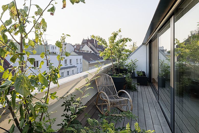 To avoid disturbing the nostalgic „Heurigen“ – atmosphere by this modern new construction but to embed this living experience, the garden atmosphere has been moved on several newly formed levels.