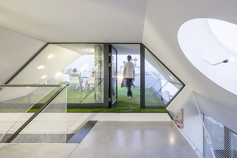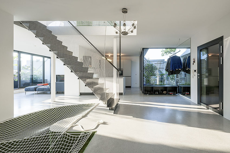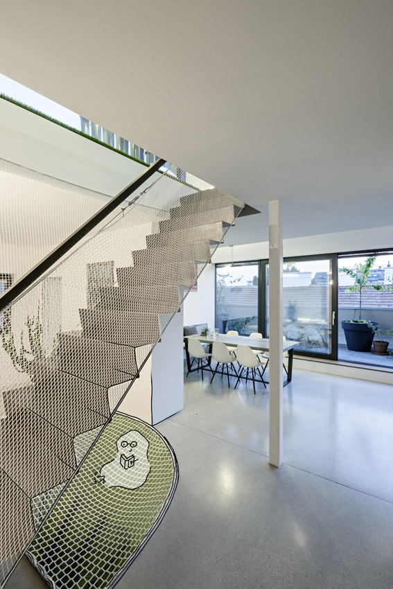 The openly desinged glassed staircase provides light for the playroom which is located in the basement.