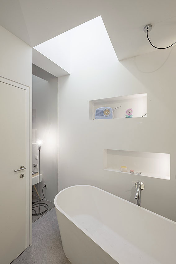 In the attic there‘s a study area flooded with light and a view all over the surrounding gardens and buildings.