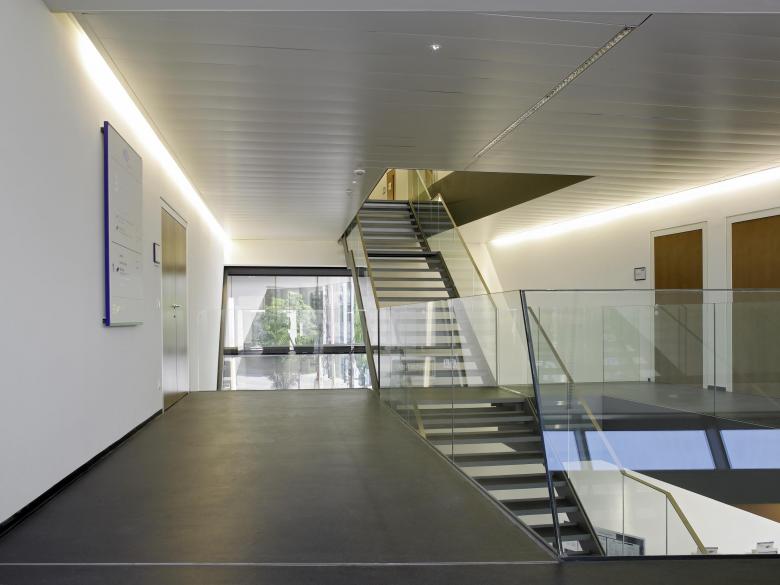 The two-storey open space, which is enclosed by the building along Bahnhofstrasse as a portal, functions as a generous entrance gesture to the quarter. This "portal area" is used publicly as a guest garden and as a center distributes the visitors to the entrances Wifi, gastronomy and tenants.
