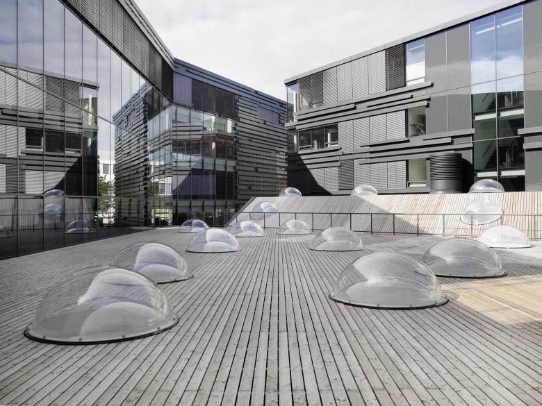 Due to the partly floating design of the building structures and the open center of the new quarter, a multiple permeable exterior space is created between the building structures as a new public - urban open space. The folded surfaces of the outdoor spaces follow the folding principle of the buildings and thus make the open space between the buildings tangible on different levels.
