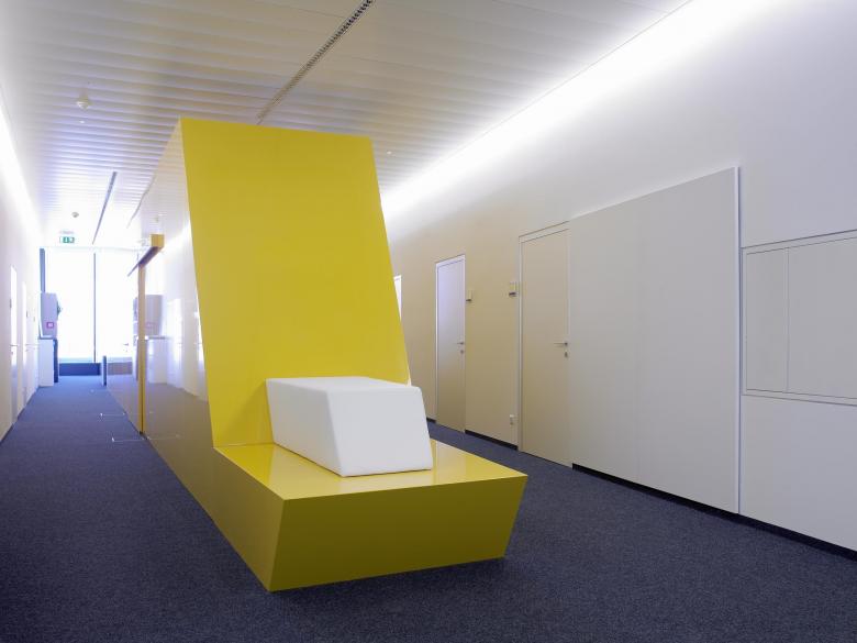 The building envelope and the large wall elements of the catering and event areas form a dynamic linear bar code as a basic layout in reference to the dynamics of the spatial elements. Analogous to the framing gesture of the "portal", the entire volume of the central gastronomy area is framed by a space-encompassing ceiling-wall-seating element.