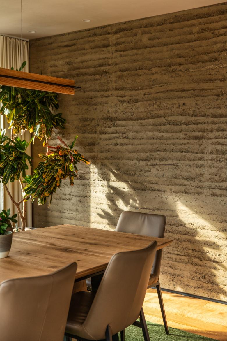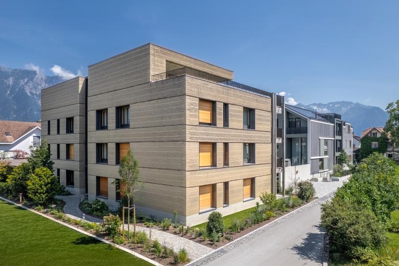 Das Haus «Lehm» besteht aus drei Etagen und einem Attikageschoss. Der Treppenhauskern und die Geschossdecken sind aus recyceltem Beton errichtet. Aussen zeigt sich das Gebäude mit seiner vorfabrizierten Stampflehmfassade in archaischer Eleganz. Die Lehmelemente haften mittels Holzprofilen an Raumgittern. So entsteht die Sekundärstruktur und thermische Hülle. Eichenfenster mit bronzenen Metallzargen strukturieren die Lochfassade. Die horizontale Gliederung der Gebäudeoberfläche mittels Ziegelleisten verweist wiederum auf die regionale Architektursprache.