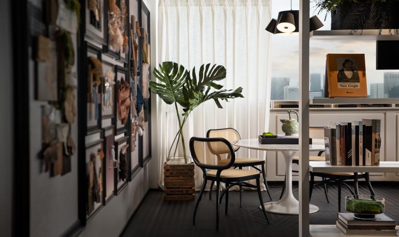 Strolling through the space feels like wandering through a garden, where every door, window, and screen carve out distinct, meticulously crafted realms, each with its own elegance.