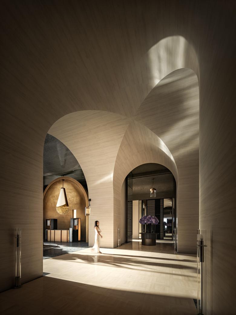 Beyond the city’s clamor, guests are welcomed into a tranquil retreat, where a manor-style garden sets the prelude to a ceremonial journey of discovery. Inspired by traditional courtyard dwellings in the Ili River Valley, the entrance unfolds as a tri-winged architectural cluster. Four distinct courtyards compose a rhythmic spatial sequence that flows from openness to intimacy, gently guiding guests through a subtle transition of mood. Local elements are reimagined through contemporary materials and craftsmanship—with the iconic blue palette of Yining houses and the intricate Kazakh wood carvings translated into refined architectural touches, most notably in the porch details. Shimmering water animates the buildings, leading travelers into a sanctuary of serene elegance.