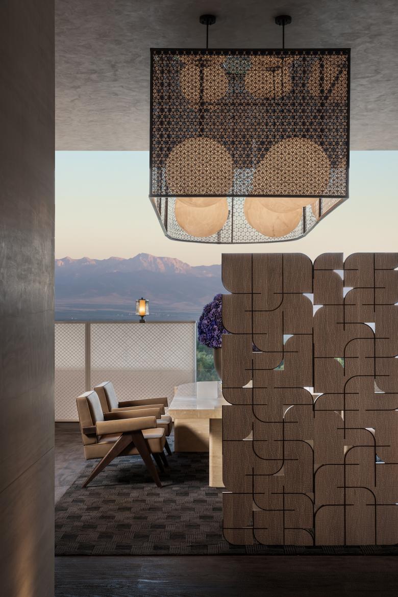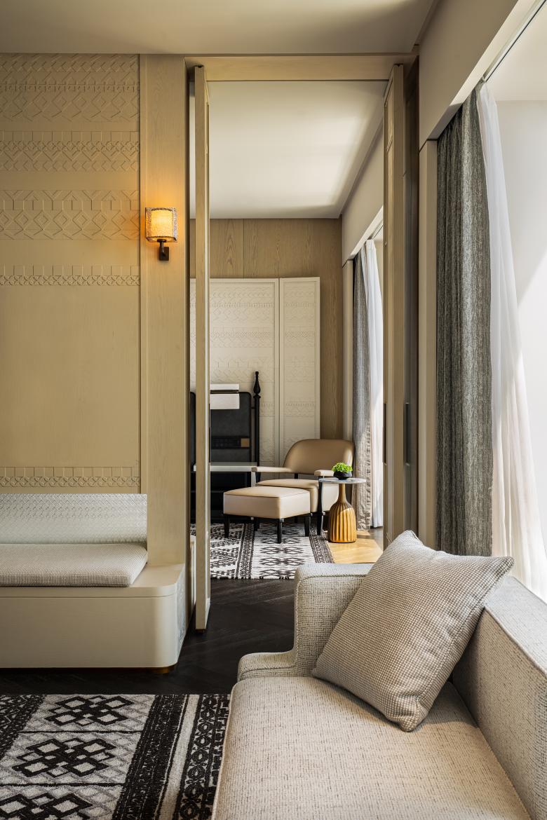 Bathed in the hues of “Yining Blue,” the guestrooms and suites evoke a tranquil dreamscape of sky and sea. The palette of soft grey and blue meets warm oak finishes, echoing the calm of the Ili River. Floor-to-ceiling windows open to sweeping views of the river valley, capturing the ever-changing sunlight and landscape. The walls carry Yining’s cultural imprint—abstract pomegranate floral patterns, distinctive window forms, and color accents derived from lavender fields, apricot blossoms, and autumn wetland reeds—each element quietly narrating the story of the land. Textured wall surfaces recall the rustic charm of traditional rammed earth, rendered in matte metal panels. Vine motifs from local wood carvings are abstracted into screen patterns, casting a poetic, ever-shifting interplay of light and shadow. Custom furnishings, artisanal woodwork, and intelligent systems weave a modern retreat of understated luxury. In every detail, the echoes of history linger, and the space becomes a quiet, contemplative storyteller.
