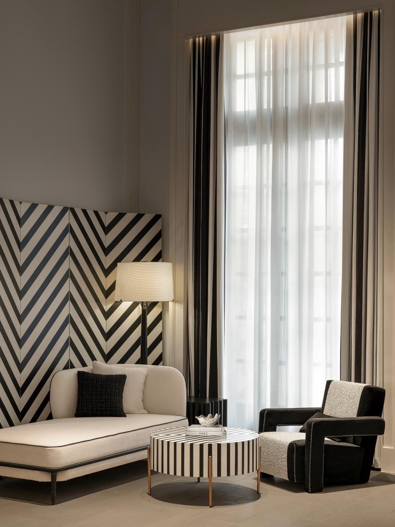 The distinctive red hues, combined with sleek modern armchairs, creates a captivating artistic ambiance. The incorporation of contemporary art into accessories, paintings, and furniture details adds a touch of sophistication. Retro floor patterns complement black and white striped modern screens, creating a striking visual statement that elevates the space.