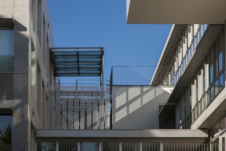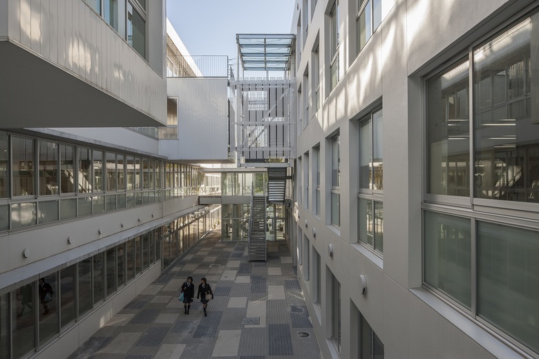 A redesign of a combined junior-senior high school located within a larger educational campus. Shiraume Gakuen Seishu Junior High School is the first stage of a plan to gradually reconstruct a number of linear school buildings making use of the void spaces interspersed between them. The school building was designed to symbolize a new educational philosophy called the “learning atrium,” in which students and teachers are able to interact freely in a series of classrooms arranged under a single roof around a large, multi-story open space. The whole structure is naturally warmed by sunlight and ventilated with windows in the top part of the building.